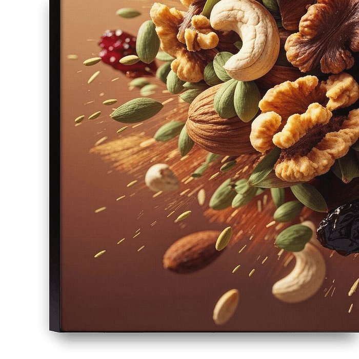 This artwork will pop off your wall - literally and figuratively. An Explosion of Healthy Breakfast Energy is a digital still life that celebrates the power and vitality of a nutritious breakfast. Nuts, seeds, apricots, dates and other natural ingredients seem to float weightlessly, captured in a moment of pure energy.