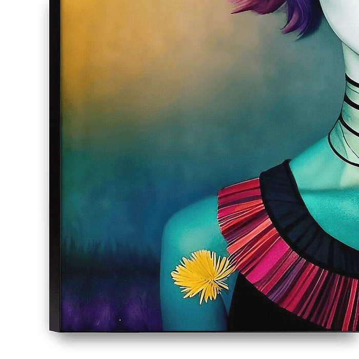 An abstract female portrait with dandelions. The woman is a cross between a female Jack the Ripper and Harley Quinn. The hat is also made of dandelion fluff. Generated using Artificial Intelligence.
