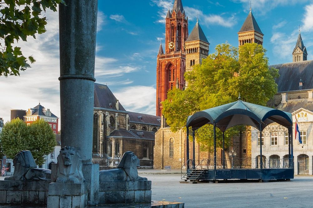An empty vrijthof in Maastricht in the morning hours with a nice view of the historic buildings of the St. Servatius Basilica, St. John's Church and the Main Guard.