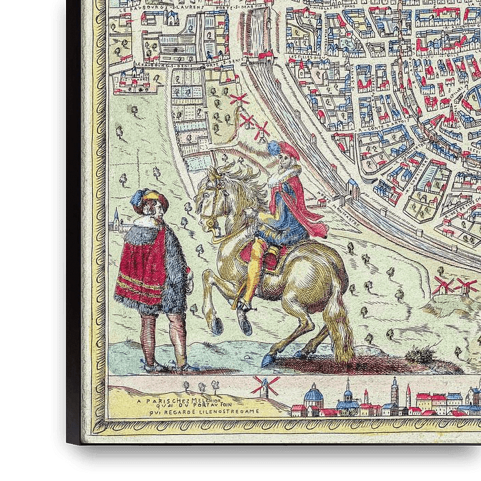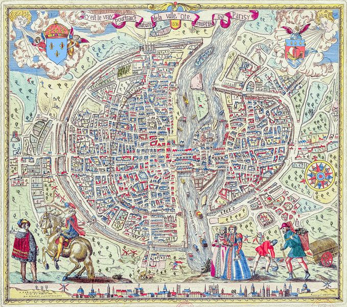 Discover the enchanting history of Paris with this beautifully illustrated historical map from 1576. The map offers a detailed overview of the city as it looked in the 16th century, at a time when Paris was developing into one of Europe's most important cultural and political centres.