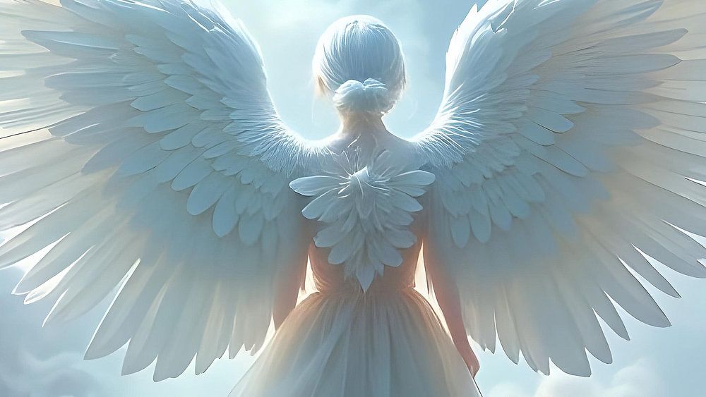 The gentle transitions between angel and clouds create a harmonious composition that is both calming and energising. Every detail of the image, from the folded wings to the delicate features of the angel, contributes to the overall effect and reinforces the message of protection and security.