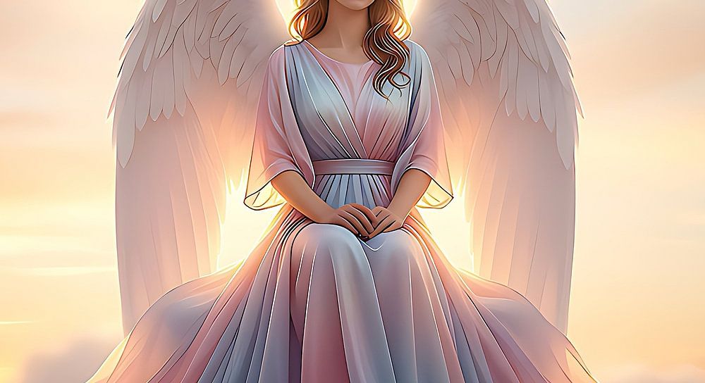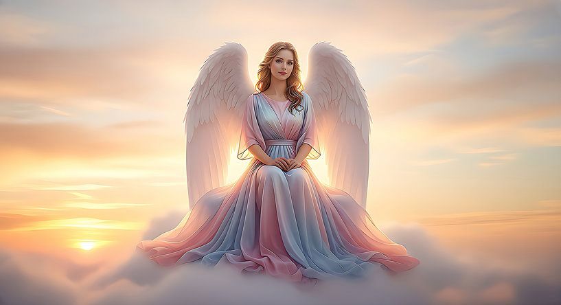 A beautiful angel with gracefully curved wings sits gently on a white, fluffy cloud. Its wings are majestic and glisten in the light as they adorn the sky. The angel wears a stunning, flowing dress of shimmering fabric that reflects the colours of the sunset - soft pinks, golds and delicate purples. The fabric of the dress flows…