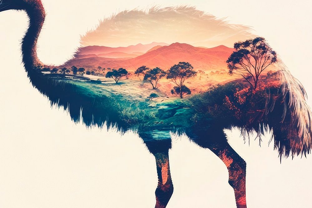 This creative work of art conveys a fascinating interplay of nature and animals. The silhouette of an ostrich is lovingly filled with a picturesque landscape that invites you to dream. Ideal for a living room, it lends any room a harmonious and inspiring atmosphere. The combination of animal and landscape inspires and stimulates the imagination.