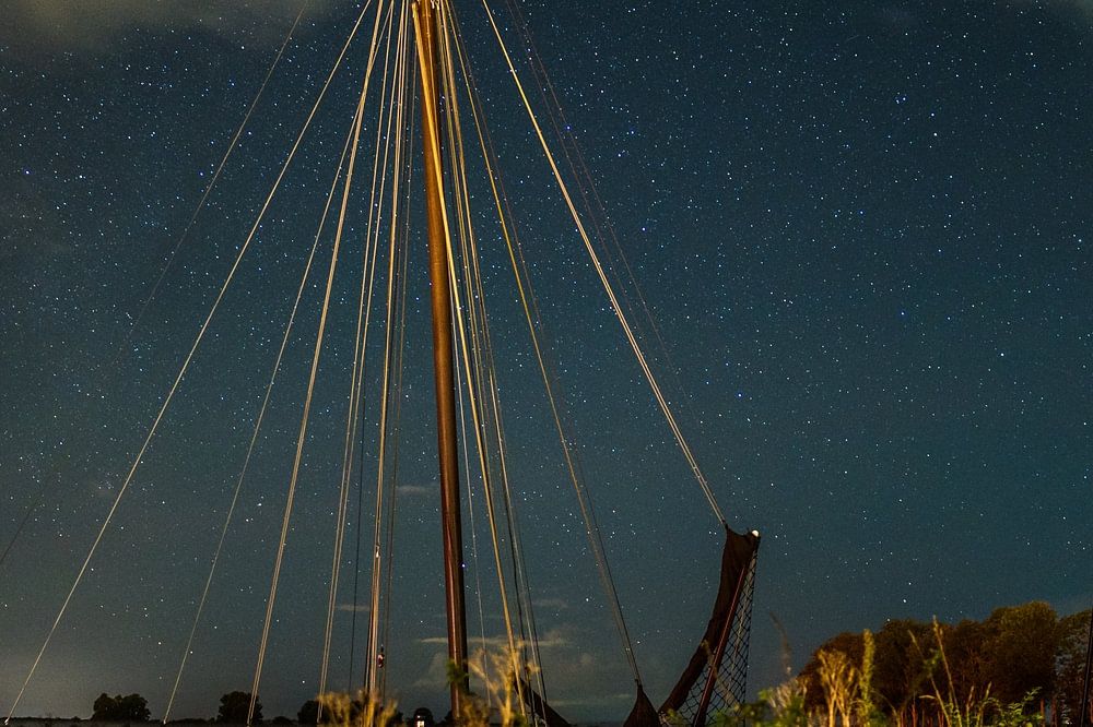 The outer harbor of Zoutkamp with brown fleet ship Anna Catharina and watchtower Kaap Garmt.