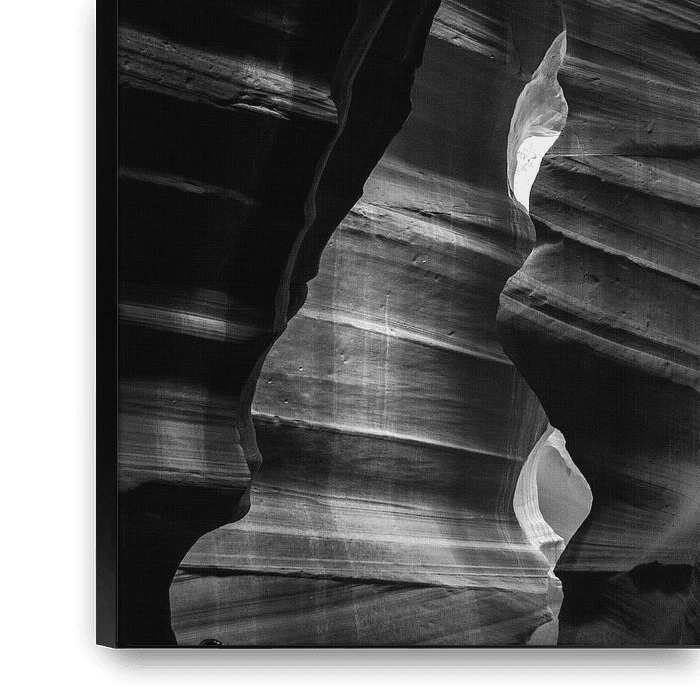 Very exciting picture of the Antelope Canyon, Arizona. The black and white emphasizes the exciting play of light in this cave and impressive texture created by erosion.
