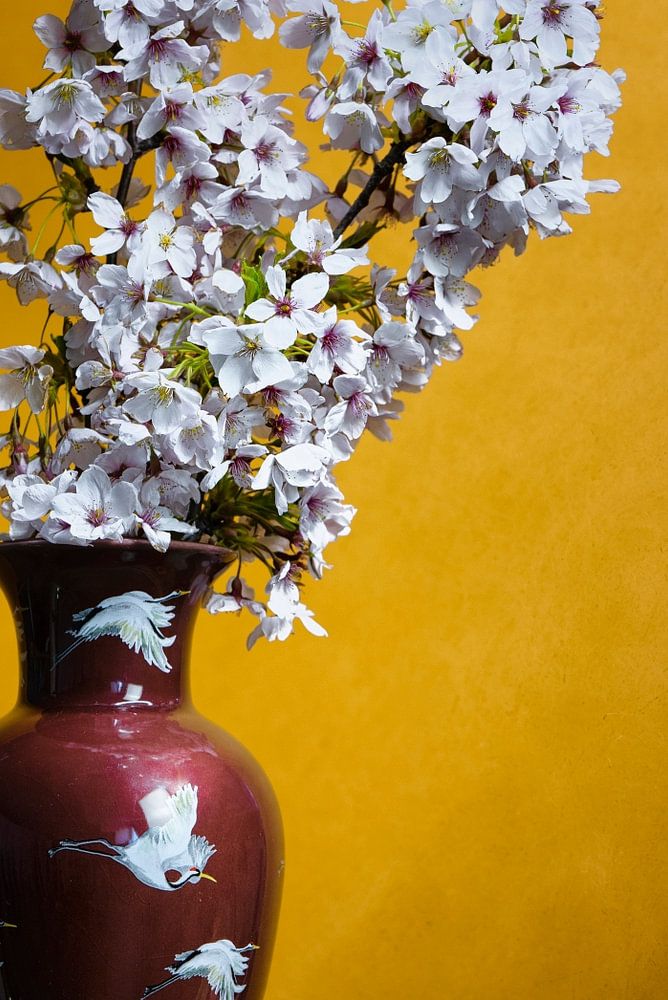 Buy this still life Apple blossom in red vase against yellow wall. by Joey Hohage on canvas, ArtFrame, poster and wallpaper, printed on demand in high quality