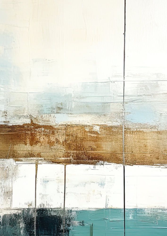 This painting evokes a sense of wonder and tranquillity. The blue/aqua, white, gold and black colours create a calm and harmonious atmosphere, while the abstract style adds a sense of depth and harmony.