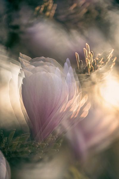 A close-up of a magnolia flower bathed in the golden light of the rising sun. Multiple exposures have been used here, creating a dynamic and artistic effect. The photograph has been creatively edited.