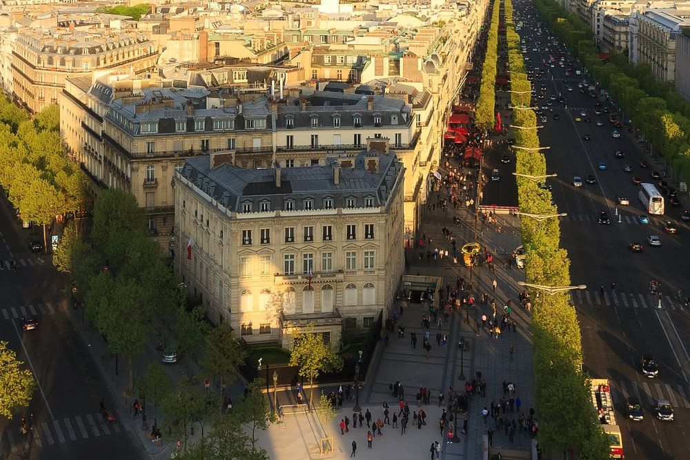 Beautiful shot of the shadow of the Arc de Triomphe in Paris, France, seen from the Arc de Triomphe with the Champs-Elysees during spring sunset