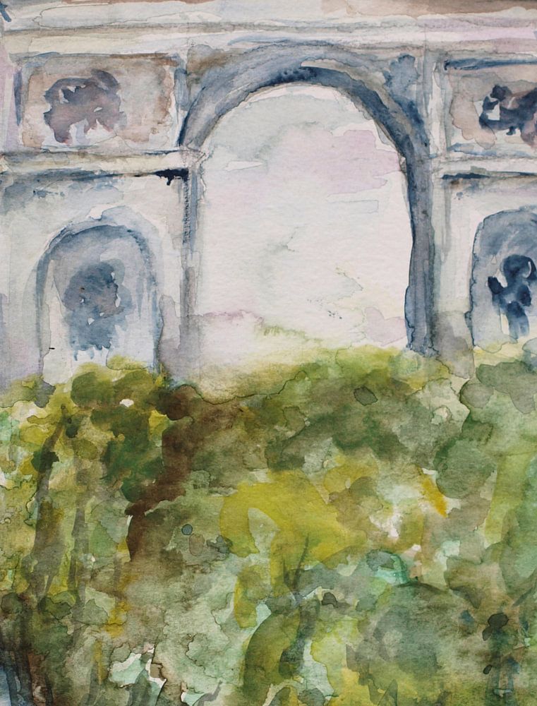 The Arc de Triomphe in Paris a monument, grand and impressive, painted in watercolor. Paris a city of grandeur with many monuments, grand and impressive.