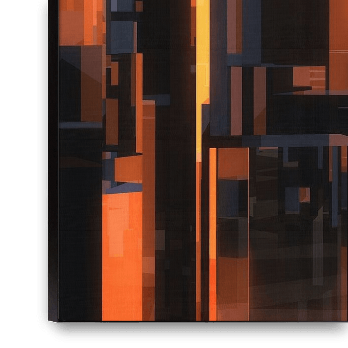 This painting shows a fantastic view of the city centre. It consists of many geometric shapes, which are depicted in a play of blue and orange. The shadows and reflections give the picture a great depth. This modern art impresses with its strong colours and the clear shapes of the skyscrapers. .