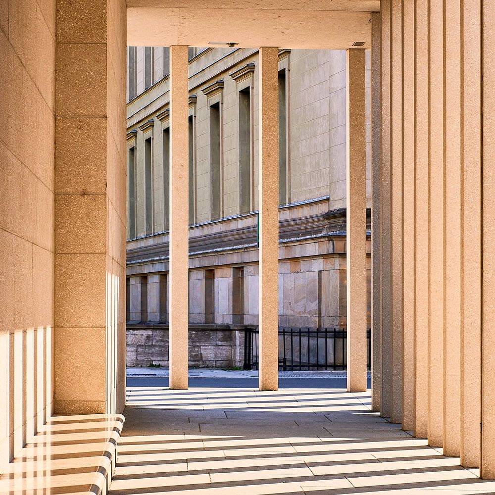 This photo is of part of the side wing of the James-Simon-Galerie on Berlin's Bodestrasse. Beautiful shadow lines from the early sunlight. Concrete posts whose structure is still clearly visible even in the photo. The bench against the wall that interrupts the rhythm of the lines well, adding a dimension to the photo.
