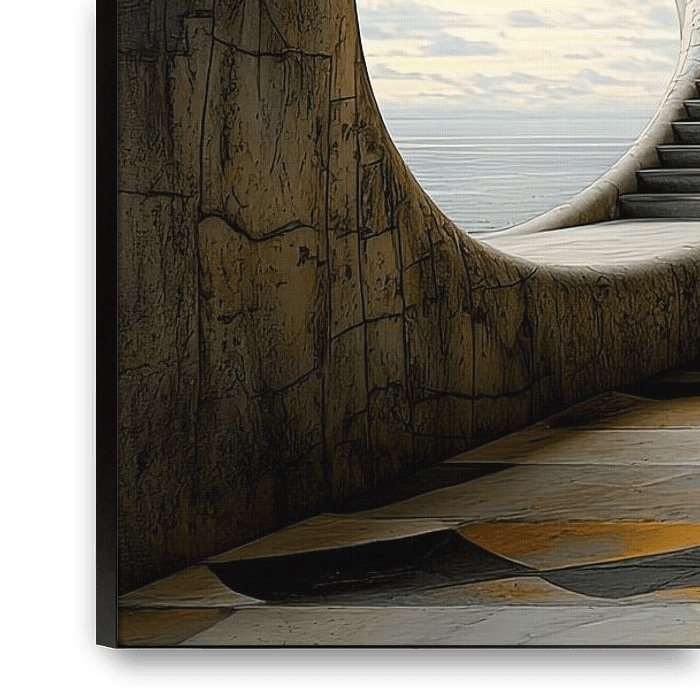 This painting transports the viewer into a surreal world of organic architecture and quiet, timeless beauty. The scene shows an elongated corridor framed by soft, flowing arches and oval openings. The structure appears to be moulded from a single, naturally grown material - a mixture of stone and bone, interspersed with fine cracks and…