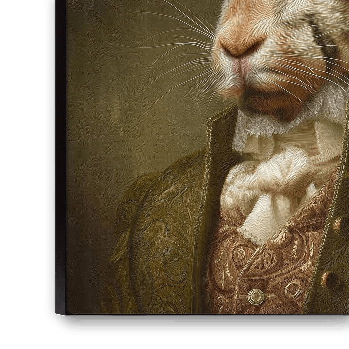 The personality given to this hare is particularly impressive - its posture appears confident and dignified, the large ears stand alertly erect. This artful blend of nature and historical fashion creates a fascinating work of art that expresses both humour and respect for the beauty of the animal world.
