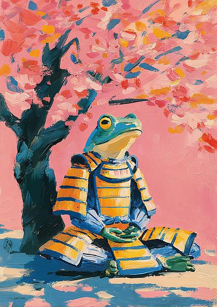 This expressive painting depicts a stylised frog in yellow and blue armour sitting in a meditative pose. The figure is rendered in bold shades of green and yellow and is flanked on the left by a tree with dark foliage and colourful accents. The background consists of a soft pink wash, while the ground is rendered in light shades of…
