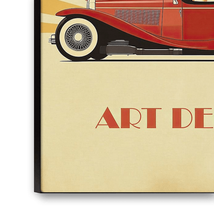 Vintage poster of an art deco car, text "ART DECO", sunbeams, simple shapes, red and beige colour palette.