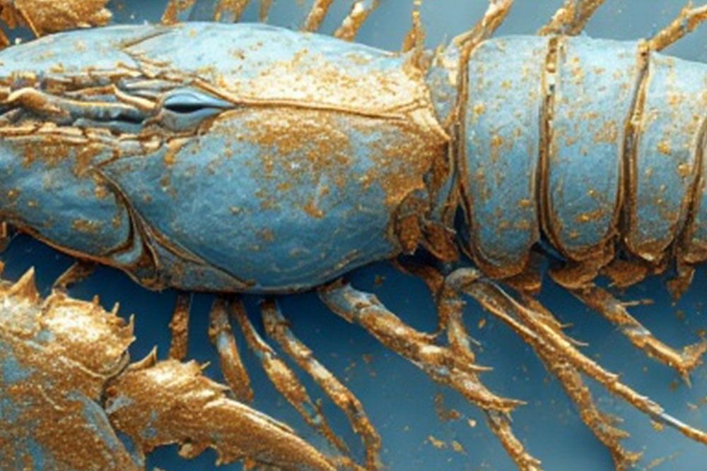 a luxurious still life of an art lobster aqua blue in colour with golden claws and stripe body on a soft blue background .