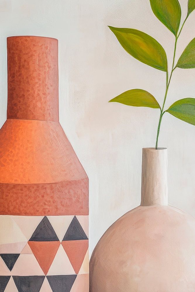 Two stylish vases, one with geometric patterns and warm earthy colours, the other simple and round, create a harmonious composition. The fresh leaves add a lively touch to the arrangement. These works of art are perfect accents for a modern living room that exudes cosiness and style.