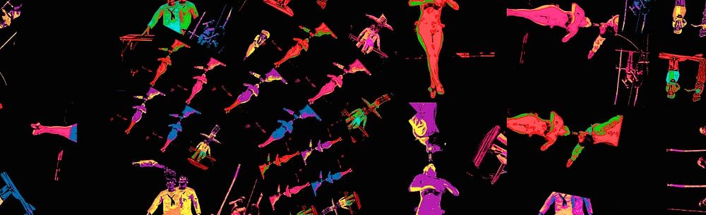 Colorful graphic with performances of various artists in circus