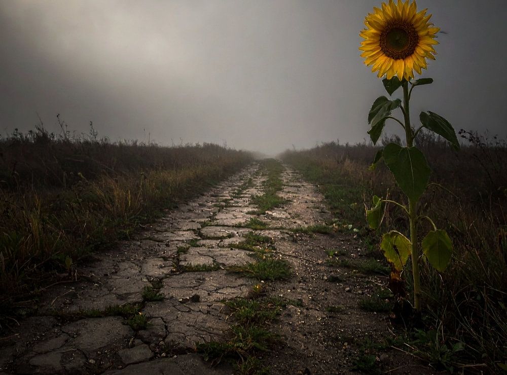 A ray of hope breaks through the gloomy grey. A sunflower defies the melancholy morning mist, lonely but steadfast. The path, seemingly endlessly marked by time, loses itself in the foggy nothingness. The light penetrates diffusely through the cloud cover. The picture tells of the courage to stand alone and still shine.