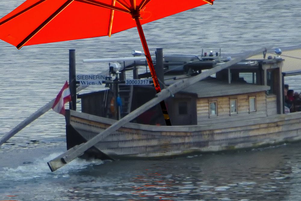 Photo montage - digital art , on the Danube , ship , passengers , transport, water transport, water idyll , Red screen Regenschorm , parasol,