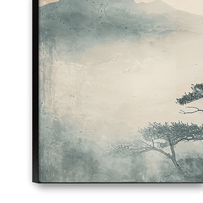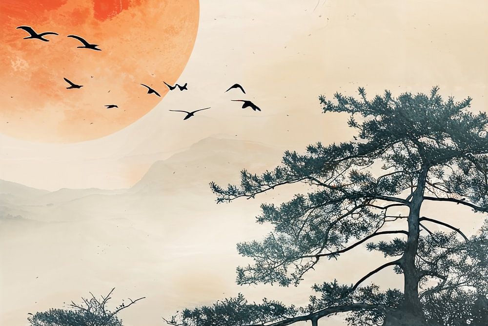 The image is an artwork depicting a traditional East Asian landscape inspired by Japanese or Chinese painting. A large, prominent red sun occupies a prominent place against a weathered background with mountains. In the foreground are several ornate pine trees, a common element in East Asian art. A flock of birds flies overhead. The entire scene is done in muted natural colours with a predominant use of shades of grey, black and the striking red-orange of the sun.