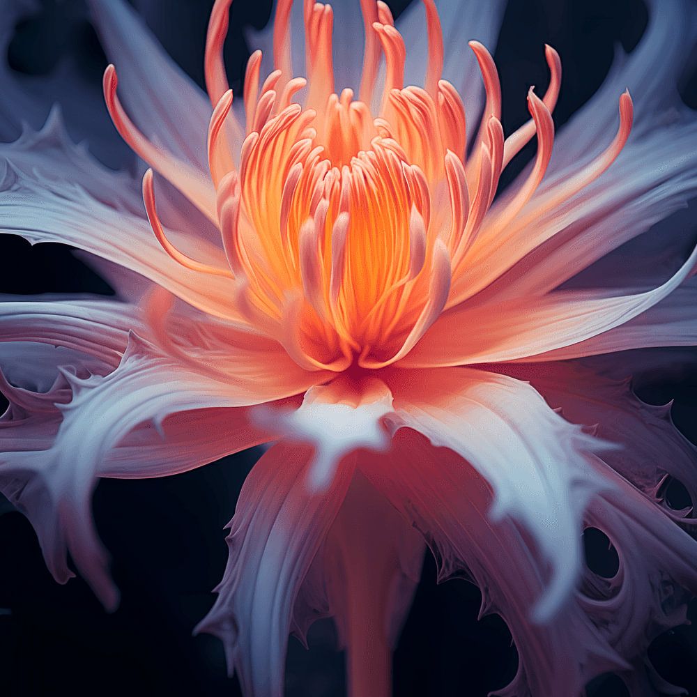 The painting depicts the beauty and fascination of flowers in a dark, black setting. The pink-orange colour of the flower and the strong pink tone in which it is enthroned give the picture a striking and captivating effect. The flower is in the centre of the painting and takes up a large part of the picture, giving it a dominant role.