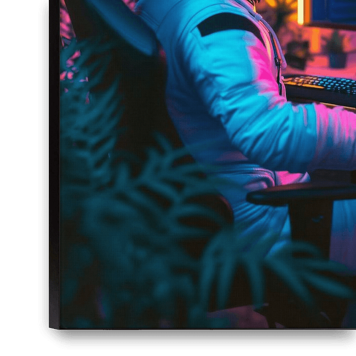 An astronaut sits amidst bright neon colours and futuristic technology, his eyes inspired by the galaxies on the monitor. Space and the digital world come together in this intergalactic gaming paradise, while plants add soft green tones to the mechanised ambience. A place where the game transcends the boundaries of the universe.