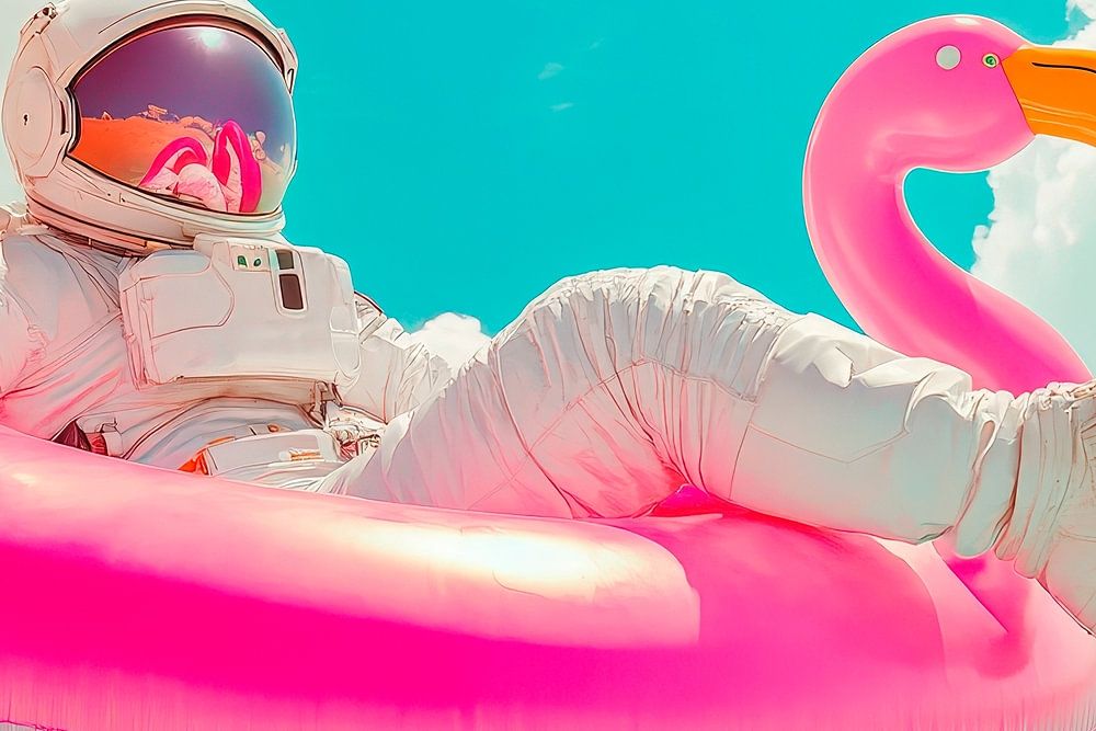 Imagine floating in a colourful dream world where an astronaut floats relaxed on a pink flamingo and admires the clouds against a bright blue background. This creative scene gives your living room a playful, dreamlike atmosphere that awakens your imagination and thirst for adventure. Ideal for anyone who appreciates something special!