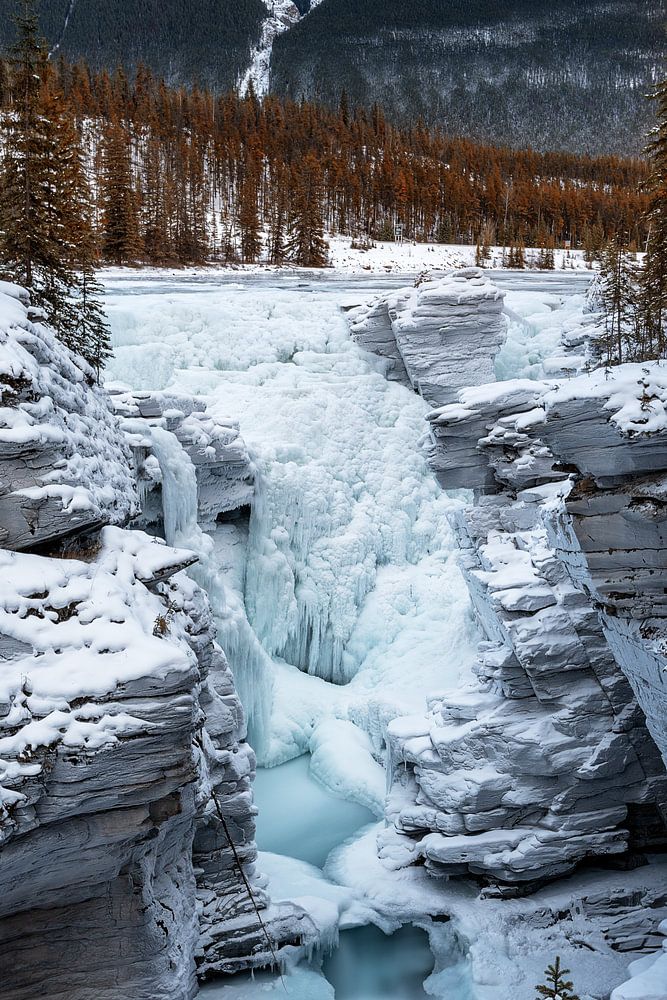 The beautiful frozen waterfalls in Jasper National park in Canada. In the middle of the winter it was -30 degrees. It made sure we had a stunning view. And can you see how big the cliff is?