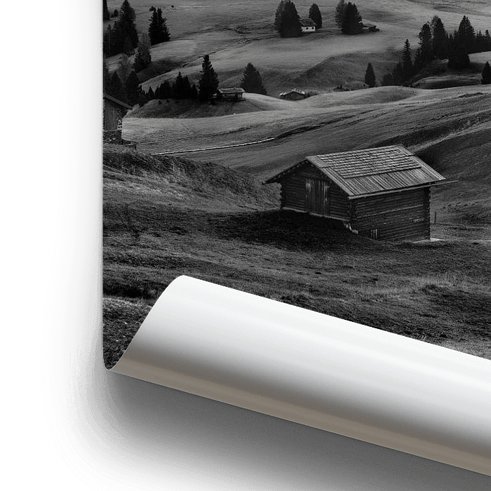 Buy this landscape artwork Atmospheric Alpe di Siusi in the Dolomites in black and white. by Manfred Voss, Black-White Photography on canvas, ArtFrame, poster and wallpaper, printed on demand in high quality.