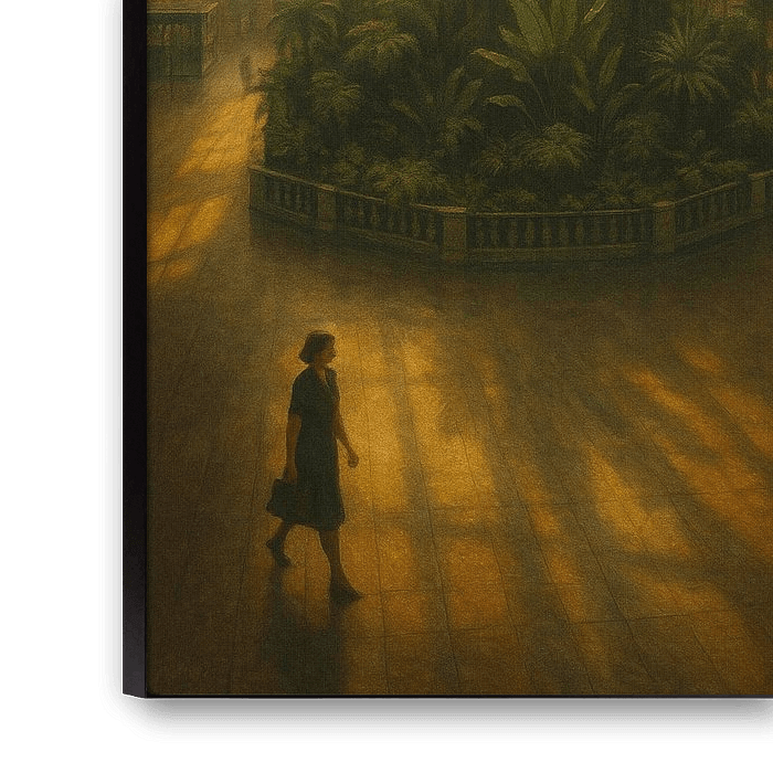 As fine wall art, Atocha Station at Sunset enriches interiors that value calm, geometry, and modern romanticism. Ideal for collectors who appreciate architectural scenes, golden tones, and urban stillness, it captures Madrid’s heartbeat in a moment of perfect peace.