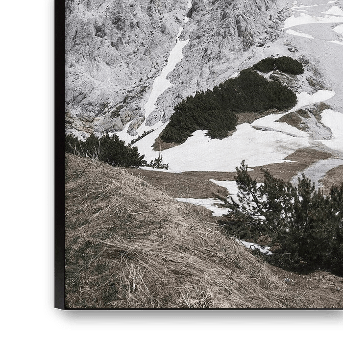 This picture was taken in the Austrian Alps during early spring, a period when nature slowly awakens from its winter rest. The image shows imposing rock formations contrasting sharply against a clear blue sky. Remnants of snow still lie between the grey mountain walls, winding through the landscape like white veins and partially covering the hiking trails. In the foreground, green bushes provide a powerful contrast to the white of the snow and the grey of the rocks. High in the sky, a bird hovers, adding a sense of freedom and space to the composition. This photo captures the unique moment when winter meets spring - a landscape full of texture, contrast and tranquillity. Perfect for lovers of mountain landscapes, nature and photography that highlights the beauty of transitional seasons.