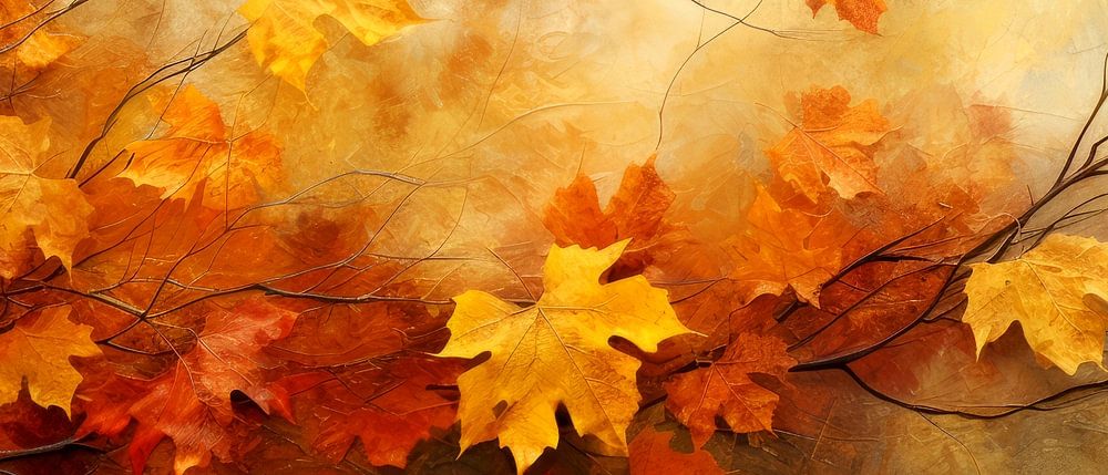 This painting exudes the serene splendour of autumn in all its glory. In the foreground, branches stretch out, heavily laden with leaves in rich and deep shades of brown and rust. The leaves seem to dance in a gentle breeze, their colours ranging from warm chestnuts to vibrant, weathered rust nuances.