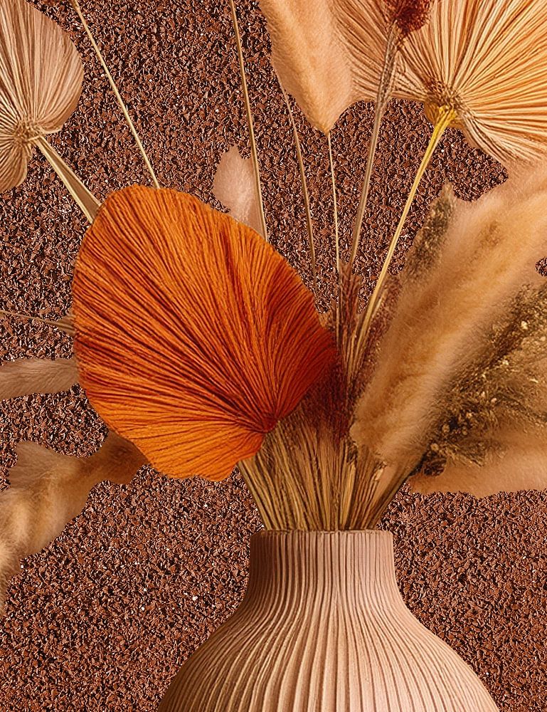 An elegant still life in which the warmth of autumn comes alive. Dry flowers in shades of rust, copper, cream and beige stand out against a textured background of cork and earth. The ceramic vase with vertical ridges gives a sense of refined tranquillity. The composition exudes natural beauty, balance and the ephemeral nature of the season.