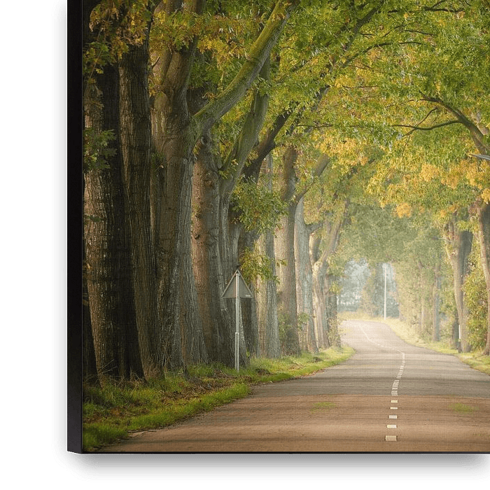 Painting photo of a road with trees in autumn. The leaves are already nicely coloured. There is a small layer of fog. This picture was taken in Drenthe, near Ees, on Eeserweg.