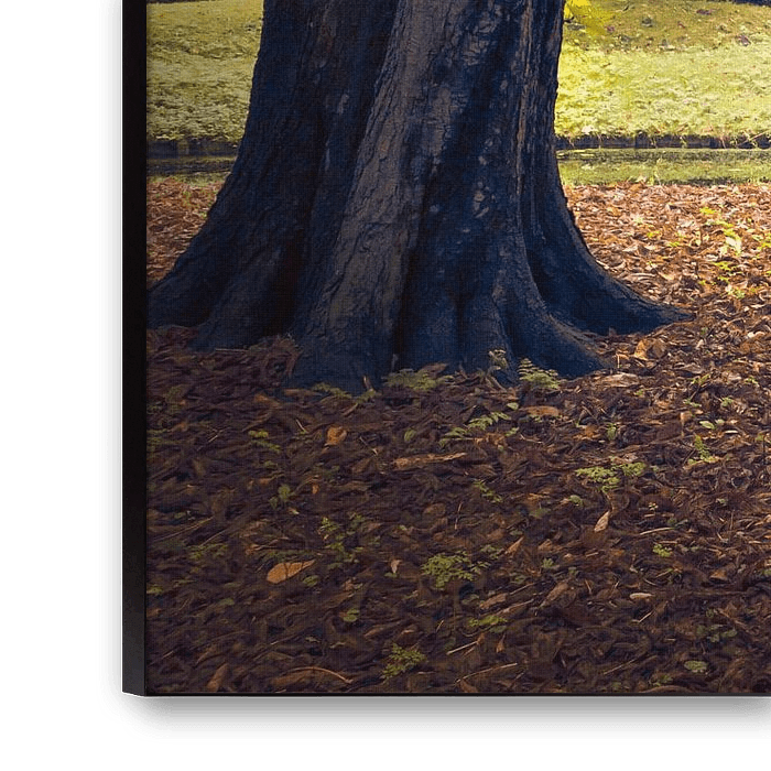 Autumn leaves cover the ground like a bronze-colored carpet. In the distance, a small bridge crossing a ditch is visible. I took the photograph on the Te Werve estate in Rijswijk. The image takes the viewer across the fallen leaves and along the dark tree trunk to the bright spot across the water.