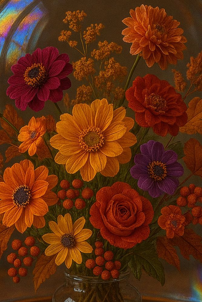 A warm and atmospheric autumn bouquet captured under a glass bell jar. Deep orange, red and purple tones come together with golden yellow leaves and berries, creating a sense of security and elegance. The soft light and subtle rainbow reflection make this still life a timeless work of art that is perfect for an autumnal atmosphere at home.