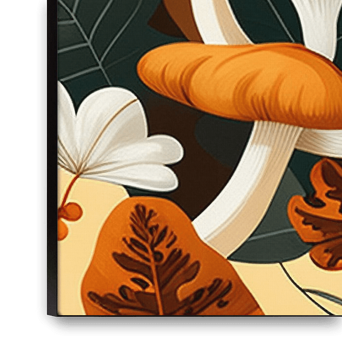 This detailed illustration features an eye-catching collection of bright orange mushrooms with white spots against a background of large, stylised leaves in earthy greens and browns. The warm, autumnal colour palette evokes the cosy feel of a forest in autumn and combines natural textures with a whimsical touch. Perfect for seasonal…