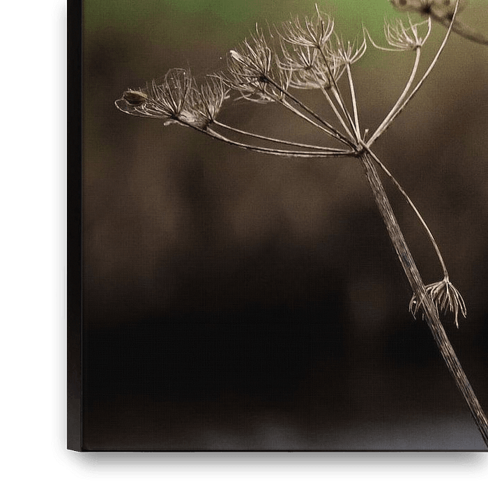 A group of delicate, spent plants stand out against a tranquil background of green fields and a grey sky. The fine details of the seeds and twigs create a complex pattern that looks almost graphic. The soft colours and subtle haze in the background add to the picture's calm and introspective mood. The image exudes a sense of stillness,…