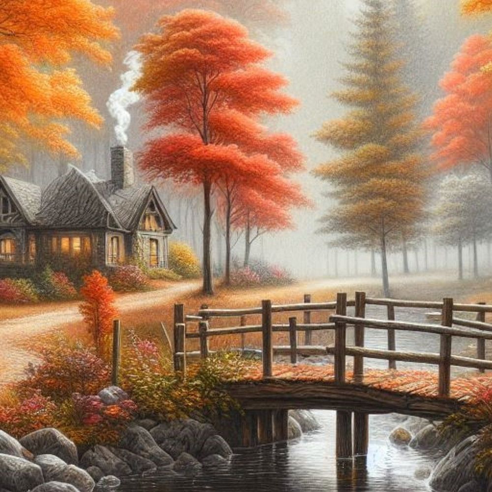 A stunning illustration that captures the essence of autumn in October. It depicts a peaceful forest scene with trees in bright colors of orange, red and yellow, and leaves gently falling to the ground. In the foreground, a small wooden bridge crosses a flowing stream, with the water reflected in the colorful leaves. The background features a picturesque cottage with smoke billowing from its chimney.
