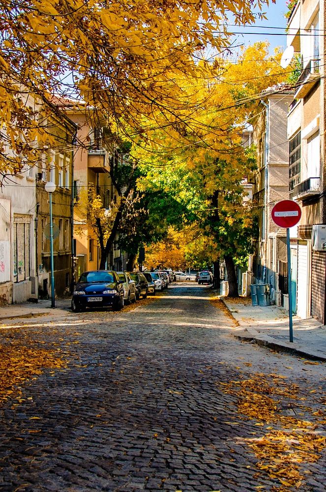 Simplicity of the beauty of a street in Plovdiv in autumn, Bulgaria.
