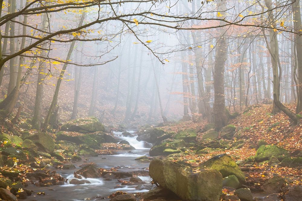 Forest bathing in the autumnal Ilse valley. The Ilse flows through the foggy and autumn-coloured forest.