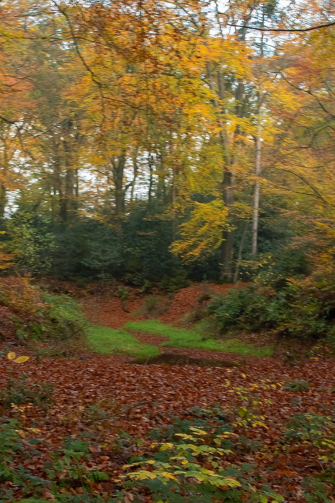 A forest in Autumn colors with a rising sun. Silence and warm colours are the most important features at this time of year.