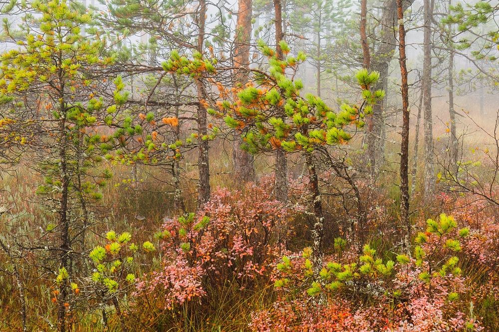 A few small pine trees stand in the moor. The mist drifts through the forest and the colours of autumn glow.