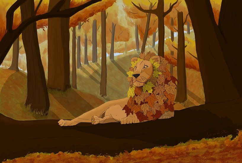 Buy this lion art Autumn lion by Iris van der Meer on canvas, ArtFrame, poster and wallpaper, printed on demand in high quality.