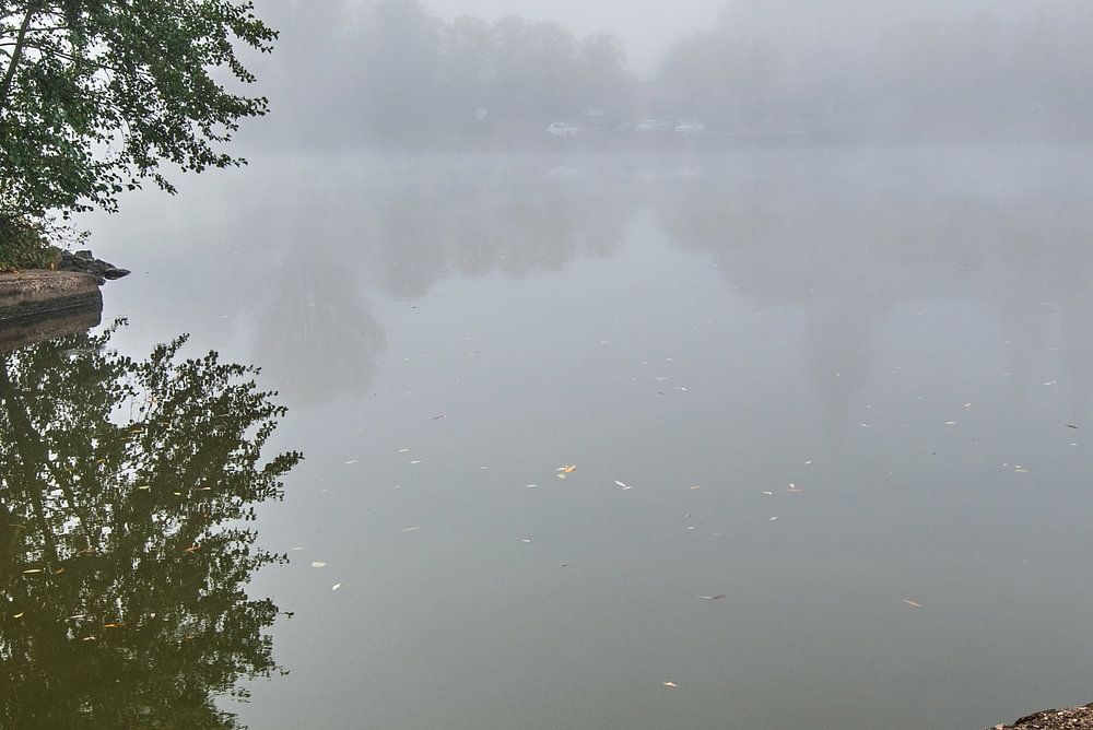Autumn mist on the river. Here at the Main ferry to Seligenstadt, Hesse.