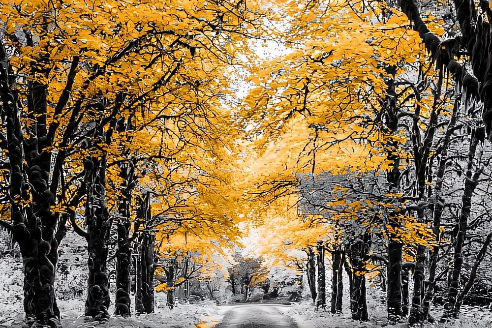 This beautiful image shows a serene avenue surrounded by trees with vibrant yellow leaves. The contrast between the warm autumn colours and the black and white background creates a breathtaking and unique visual effect. Perfect as a wall decoration to bring a warm and modern atmosphere to your space. Ideal for lovers of nature and contemporary design, and suitable for different interior styles. This picture exudes tranquillity, elegance and a touch of mystery, making it a real eye-catcher in any room.