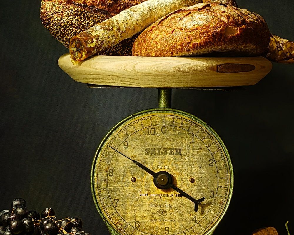 Warm , beautifully lit still life with autumn feel , old antique scale with various types of bread , cheddar cheese, blue and white grapes , garlic and grape leaf .
