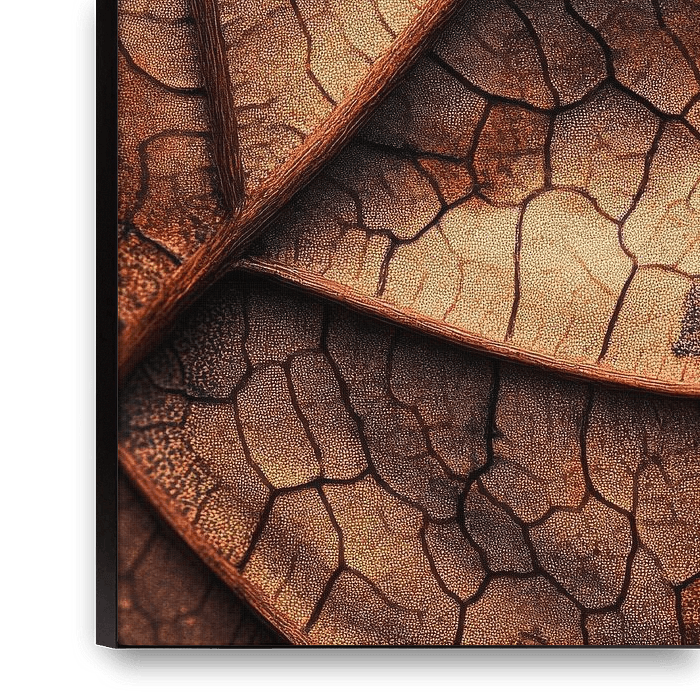 A fascinating mosaic of dried leaves unfolds, interspersed with mysterious cracks and warm earthy tones. The fine veins look like natural works of art that tell stories of days gone by. Each layer seems to bear the weight of time, while gentle plays of light bring the textures to life. A tribute to the transience of nature.